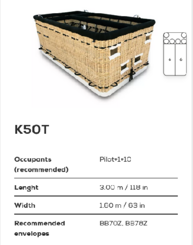 Standard finish: all-cane, suede, standard equipment: 4 karabiners, 10 tank straps, 4 support poles and covers in bag, straining beam (2 X-crosses), drop line, wall-pocket, first-aid box, nomex extinguisher sheet. Pilot restraint harness, cushion floor.